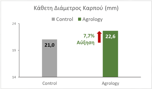 Εικόνα 2. Κάθετη Διάμετρος Καρπού (mm). Με την εφαρμογή του προγράμματος Agrology, επιτεύχθηκε αύξηση της κάθετης διαμέτρου καρπού κατά 1,61 mm (+7,7%), συγκριτικά με τον Μάρτυρα.
