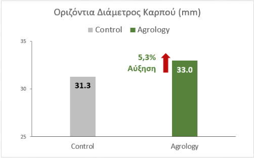 Εικόνα 3. Οριζόντια Διάμετρος Καρπού (mm). Με την εφαρμογή του προγράμματος Agrology, επιτεύχθηκε αύξηση της οριζόντιας διαμέτρου καρπού κατά 1,65 mm (+5,3%), συγκριτικά με τον Μάρτυρα.
