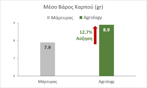 Εικόνα 5. Μέσο Βάρος Καρπού (g). Με την εφαρμογή του προγράμματος Agrology, επιτεύχθηκε αύξηση του μέσου βάρους καρπού κατά 1 g (+12,7%), συγκριτικά με τον Μάρτυρα.