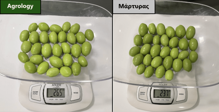 Κατά τη διάρκεια του αποδεικτικού αγρού, πραγματοποιήθηκαν δειγματοληψίες στις δύο μεταχειρίσεις, Μάρτυρα και Προγράμματος Agrology. Ως αποτέλεσμα, το Πρόγραμμα Agrology επέφερε εντυπωσιακά αποτελέσματα στα αγρονομικά χαρακτηριστικά στην καλλιέργεια Επιτραπέζιας Ελιά​​ς​​, προς όφελος του παραγωγού.